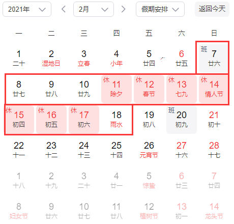 根据国务院节假日放假安排的通知,结合我司实际情况,定于2月7日至2月18日(初七)为春节假期,2月19日(初八)恢复正常上班。